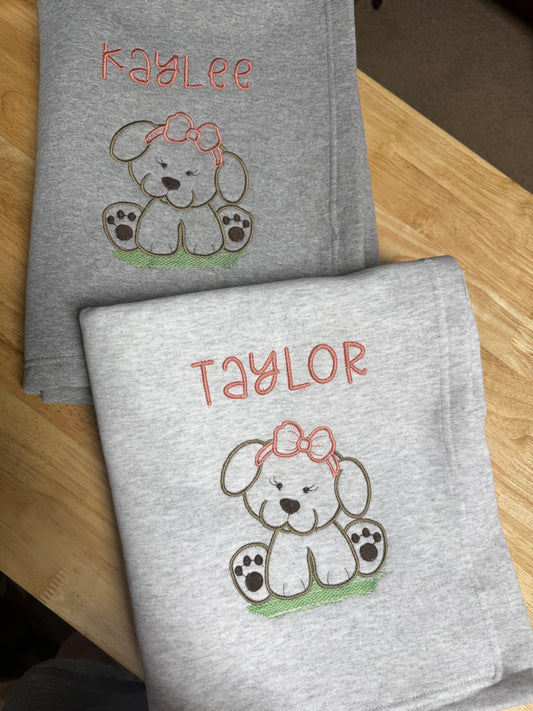 Personalized Puppy Sweatshirt Blanket - Embroidered with boy or girl puppy and child's name - 50" x 60"