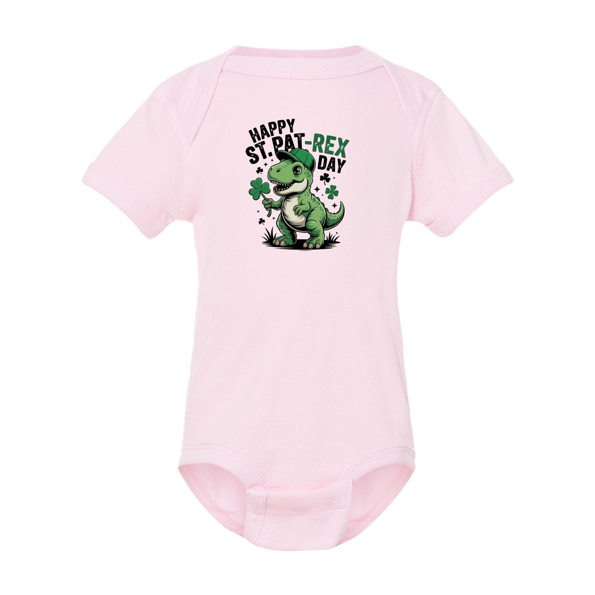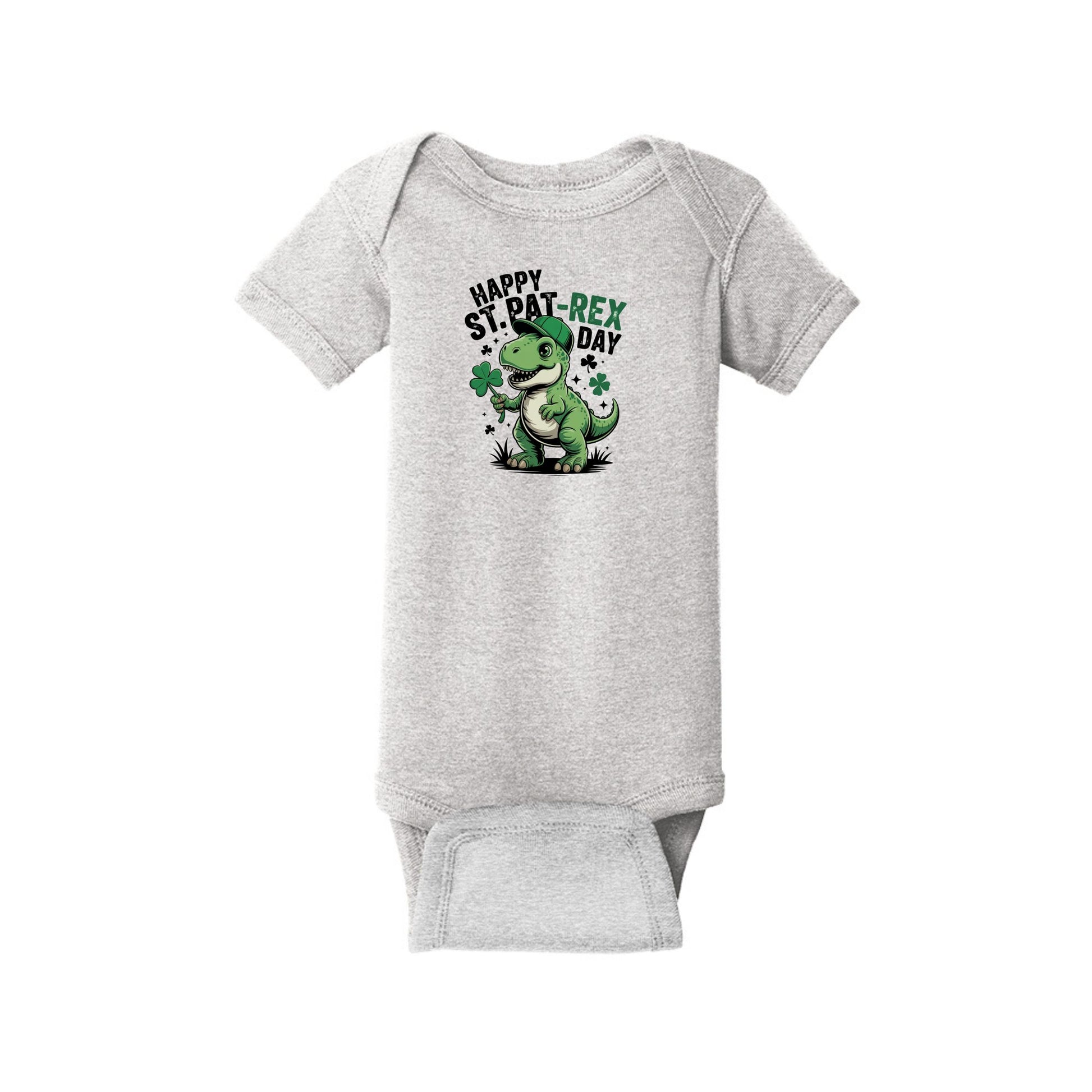 Let your little lucky charm celebrate in dino-mite style! This adorable “Happy St. Pat-Rex Day” bodysuit features a festive T-Rex ready to stomp into St. Patrick’s Day with shamrock spirit and big smiles.