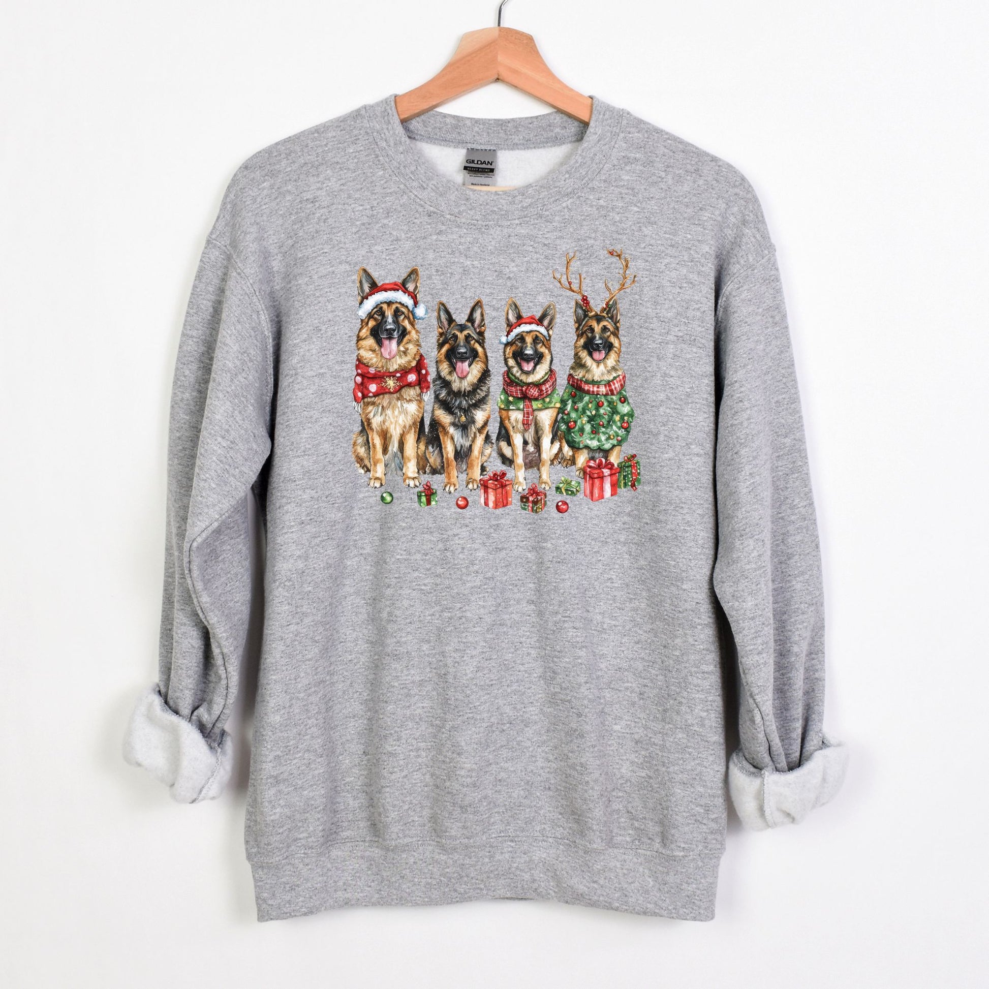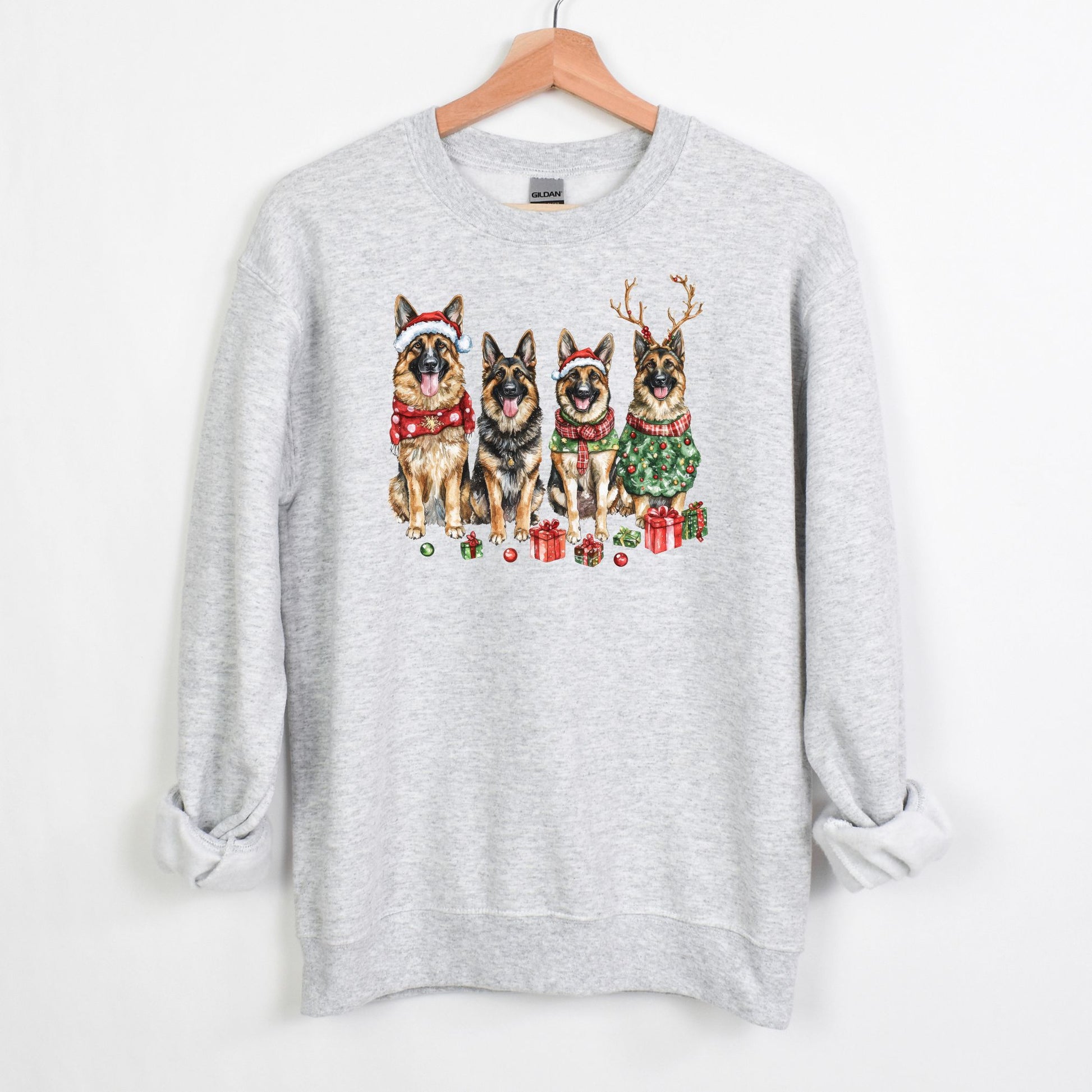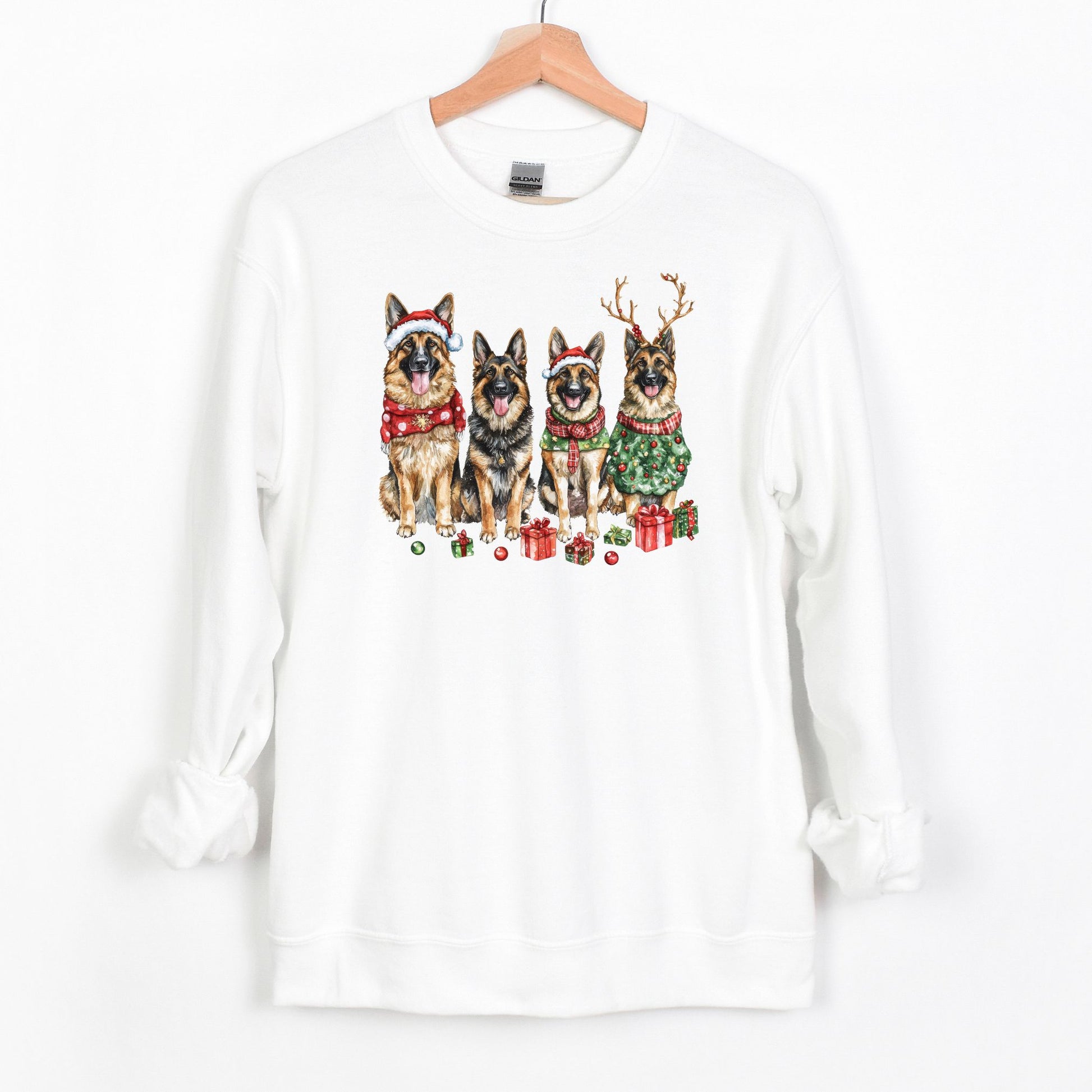 Vibrant Design: Watercolor German Shepherds in holiday attire make this sweatshirt a standout piece.