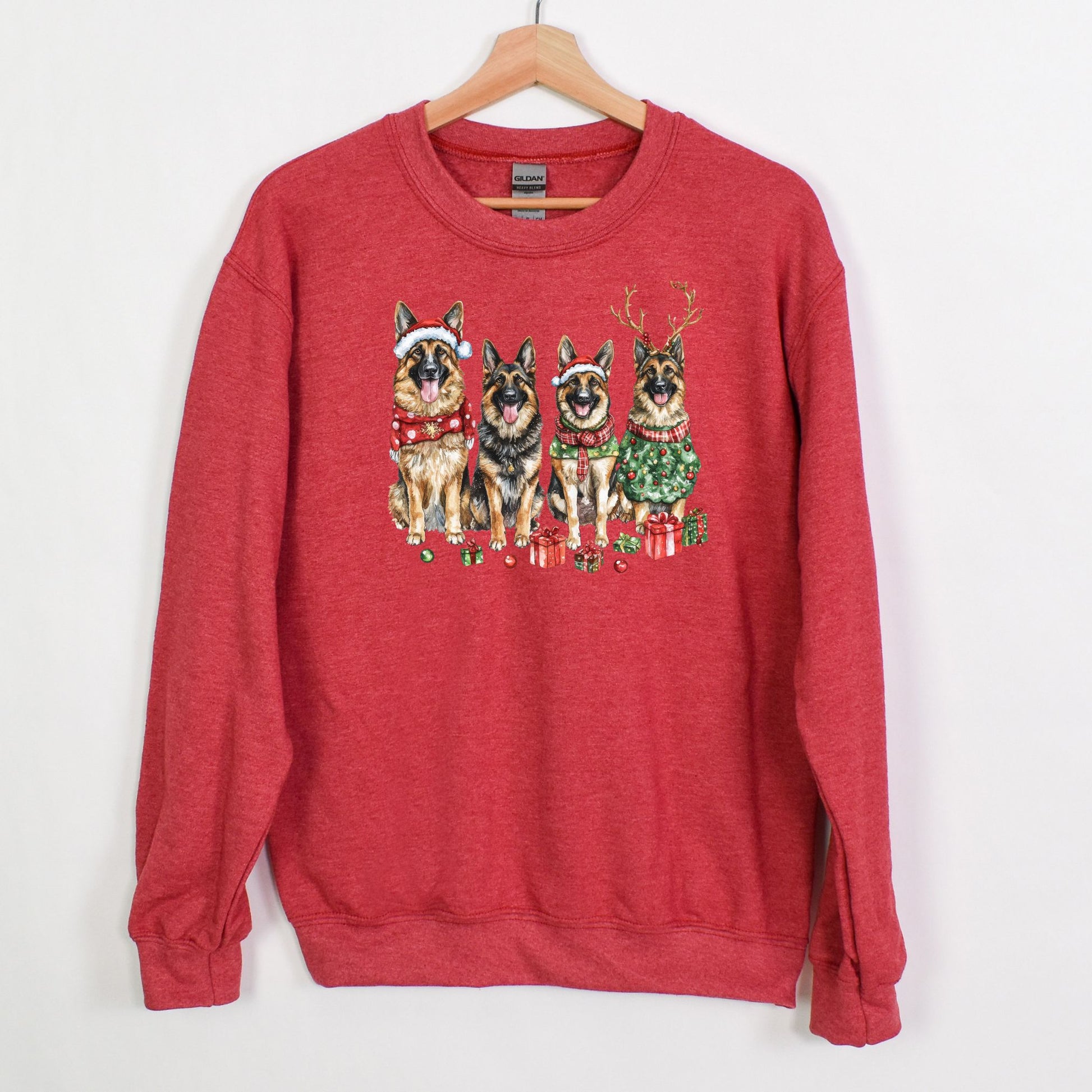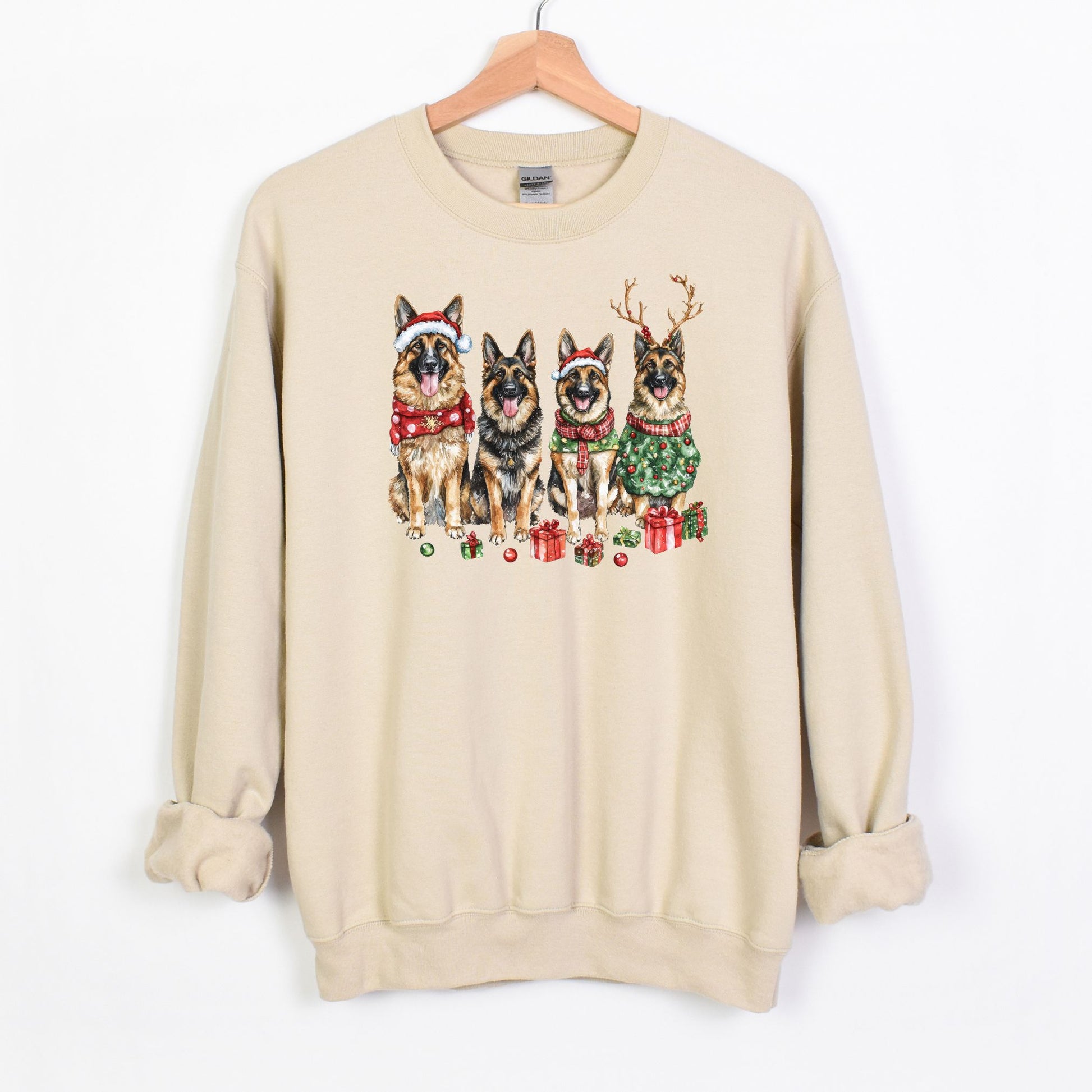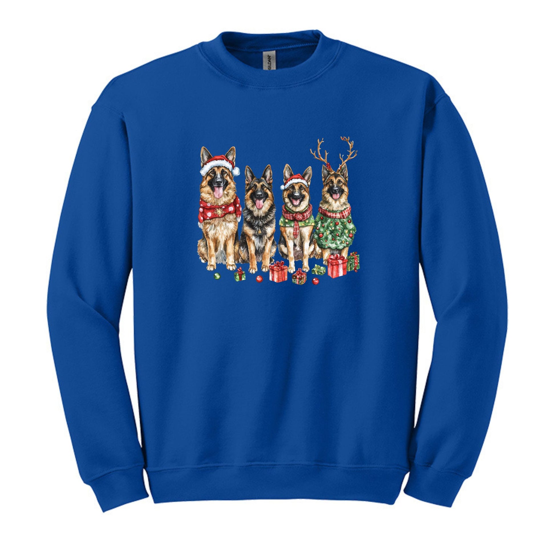 Vibrant Design: Watercolor German Shepherds in holiday attire make this sweatshirt a standout piece.